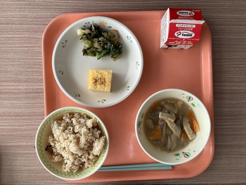 とうふめし、ぐんまちゃん玉子焼き、ほうれん草の磯和え、こしね汁、牛乳