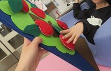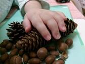 ぶどうやりんごといった果物、落ち葉、松ぼっくり、どんぐり、さつまいもなどの季節のものを使用して、秋を感じる活動を行いました。直接触って感触を確かめるだけでなく、果物狩りを体験したり、袋の中で木の実が鳴る音を楽しんだりと、それぞれの方法で秋を感じることができました。