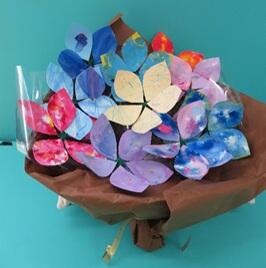 みんなで作ったお花を1つにまとめ、花束にしたものを学習発表会で展示しました。個性豊かなお花が合わさって、迫力のある作品になりました。