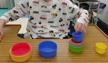 いろいろな形や大きさに着目して、〇や△の教材を同じ形の穴に入れる学習や、カップを大きい順に重ねていく活動を積み重ねています。試行錯誤しながら取り組む姿や、うまくできたときには担任を見て満足そうな表情が見られます。